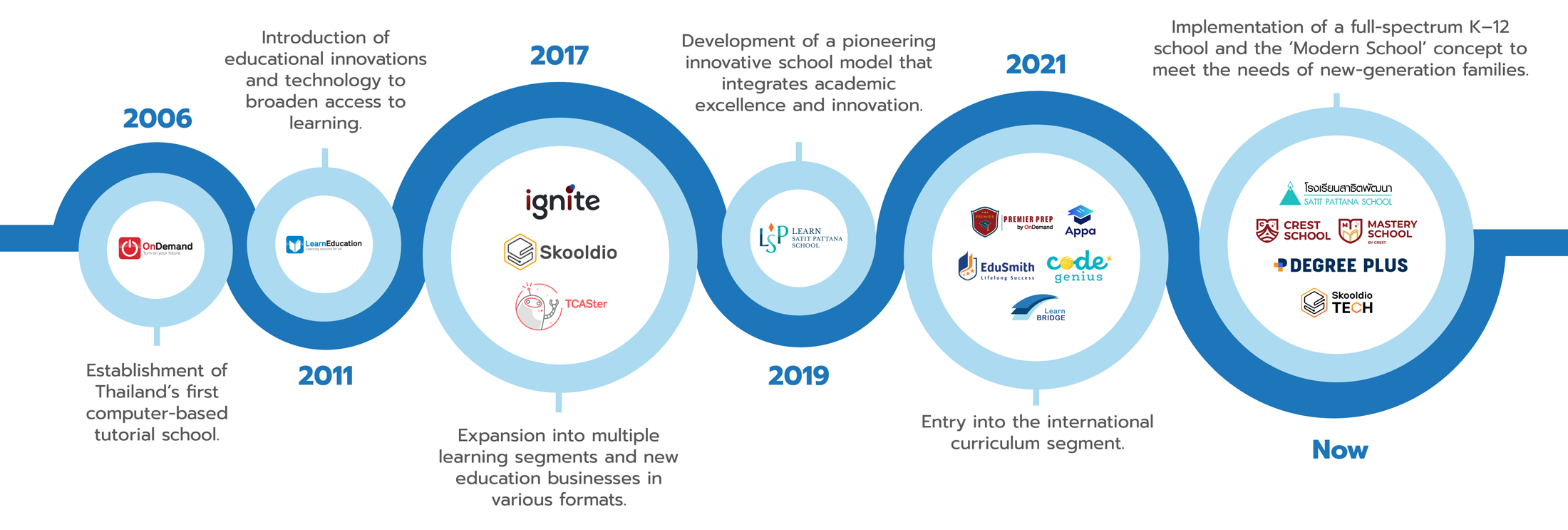 จึงก่อตั้งสถาบัน OnDemand ผู้นำด้านการสอนพิเศษแห่งแรกที่นําคอมพิวเตอร์มาเป็นสื่อการเรียนการสอน และเป็นสถาบันสอนพิเศษอันดับหนึ่งที่มีผู้เรียนมากที่สุดในไทย ในปี พ.ศ. 2560 LEARN Corporation ได้อดีต Data Scientist จากองค์กรเทคโนโลยีระดับโลกมาร่วมสร้างทีม Technology คิดค้นแพลตฟอร์มและนวัตกรรมการศึกษาที่ตอบโจทย์และครอบคลุมทุกช่วงวัย เกิดเป็น Learning Ecosystem ที่สามารถสร้างการเรียนรู้ตลอดชีวิตและเข้าถึงคนแล้วกว่า 2.5 ล้านคนทั่วประเทศ โดยแบ่งเป็น 3 กลุ่มธุรกิจ ได้แก่